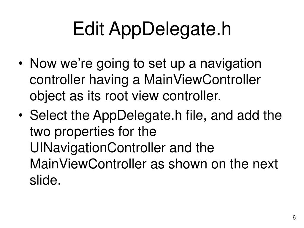 Edit AppDelegate.h • Now we’re going to set up a navigation controller having a MainViewController object as its root view controller. • Select the AppDelegate.h file, and add the two properties for the UINavigationController and the MainViewController as shown on the next slide.