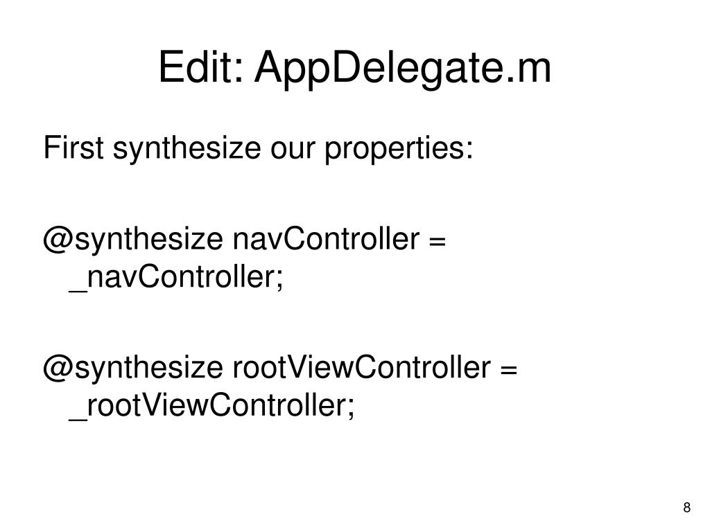 Edit: AppDelegate.m First synthesize our properties: @synthesize navController = _navController; @synthesize rootViewController = _rootViewController;
