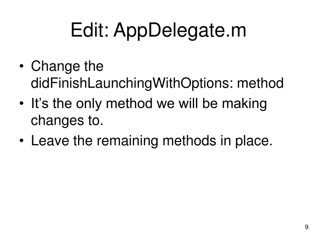 Edit: AppDelegate.m • Change the didFinishLaunchingWithOptions: method • It’s the only method we will be making changes to. • Leave the remaining methods in place.