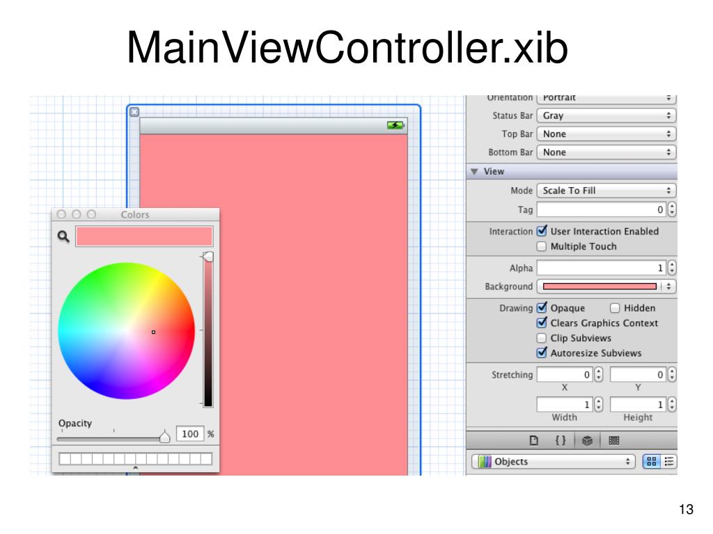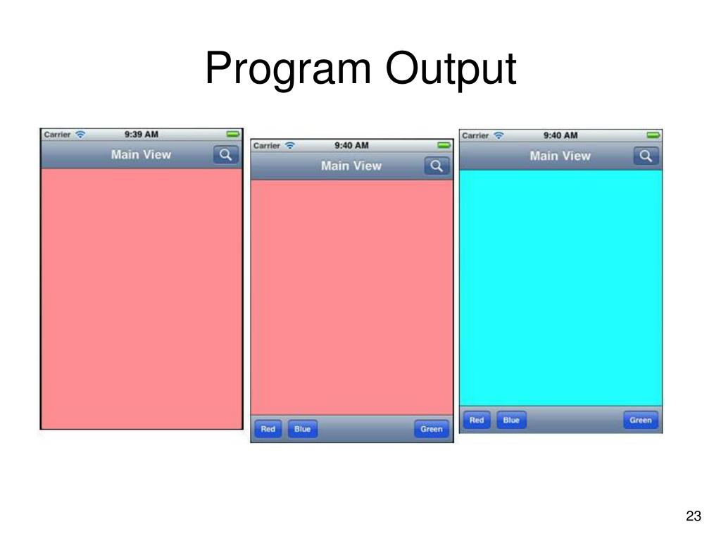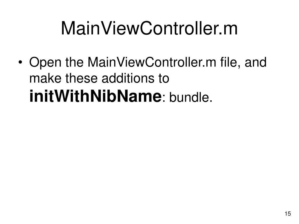 What are we doing? • First, we allocate and initialize the rootViewController. • The nib name of nil in this case directs the compiler to associate this controller with the XIB file that was created with it (MainViewController.xib). • A bundle of nil directs the compiler to use this application’s bundle. • After we initialize this controller, we set its title to @”Main View.” This title will appear in the navigation bar for this view controller.