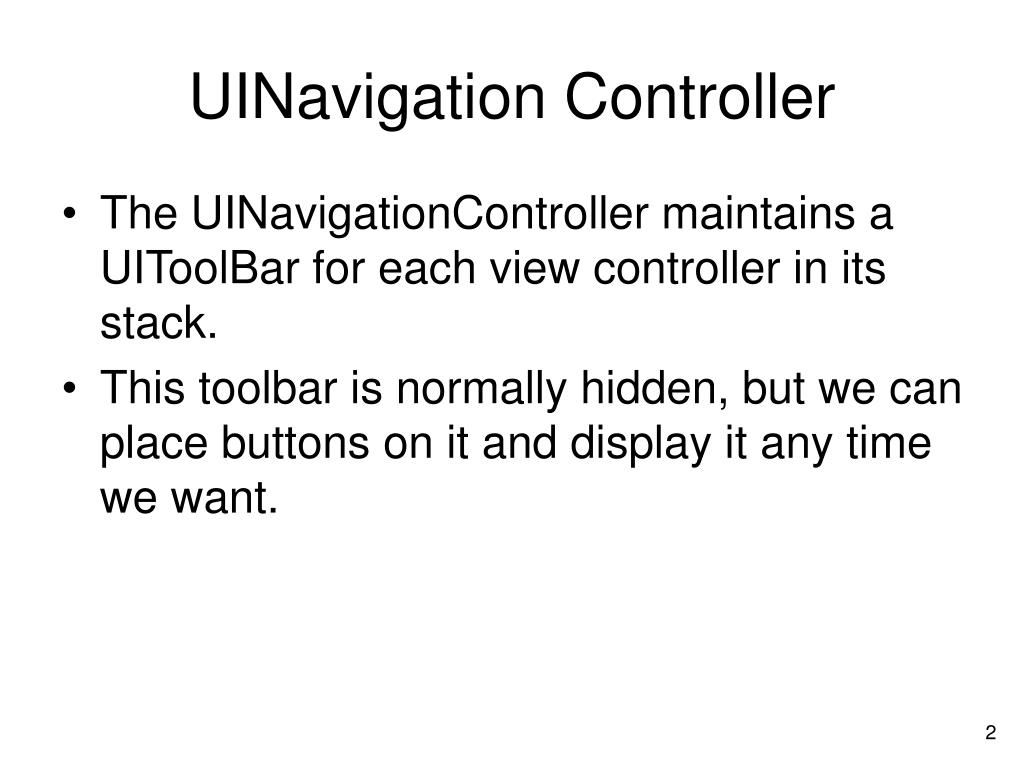 Designing with a UIToolBar. iPhone/iPad, iOS Development Tutorial. UINavigation Controller. The UINavigationController maintains a UIToolBar for each view controller in its stack. This toolbar is normally hidden, but we can place buttons on it and display it any time we want.