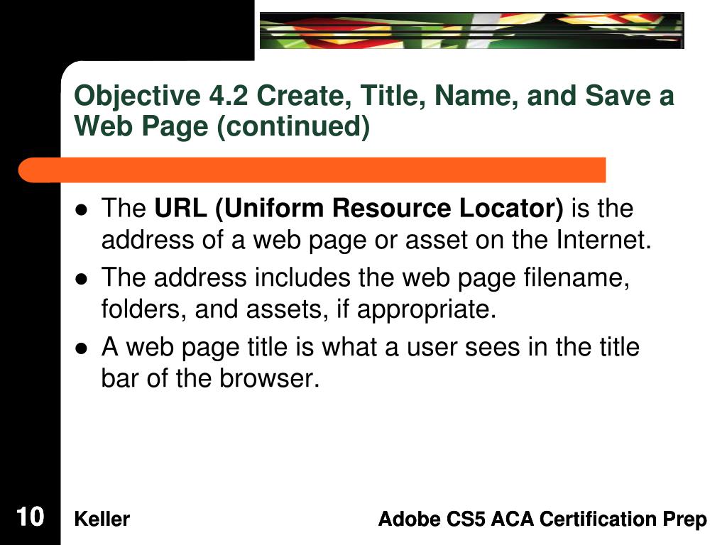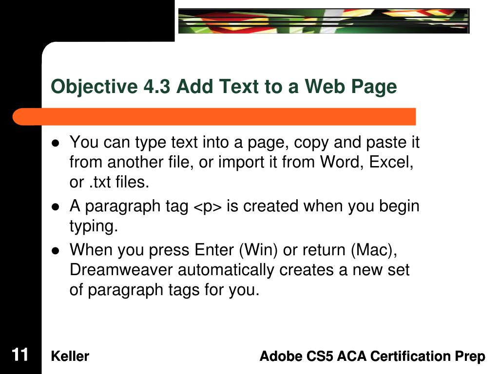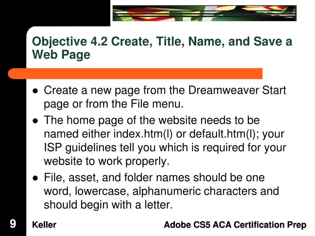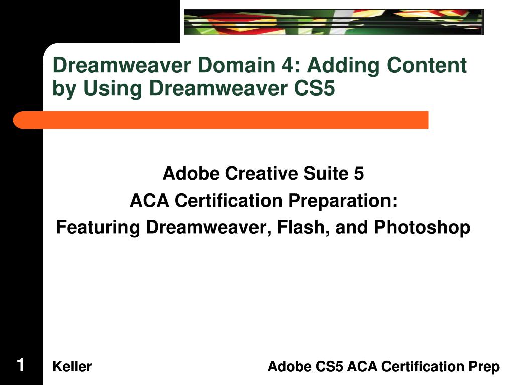 Dreamweaver Domain 4: Adding Content by Using Dreamweaver CS5. Adobe Creative Suite 5 ACA Certification Preparation: Featuring Dreamweaver, Flash, and Photoshop. 1. 1. Objectives. Define a Dreamweaver site. Create, title, name, and save a web page. Add text to a web page.