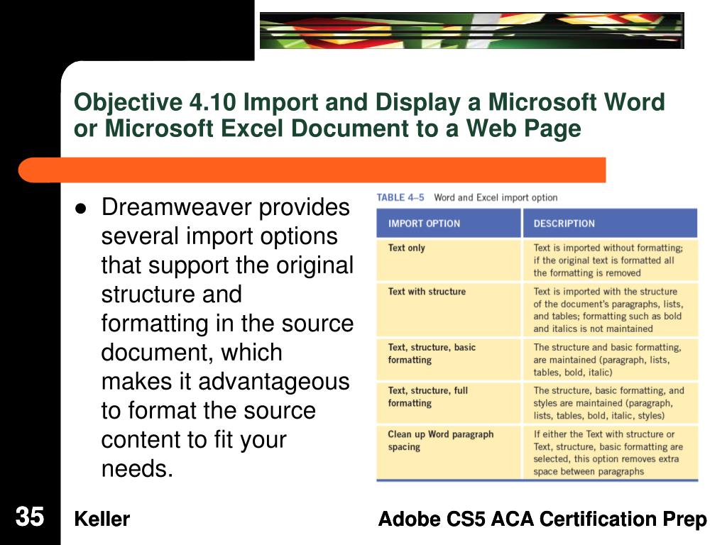 Objective 4.10 Import and Display a Microsoft Word or Microsoft Excel Document to a Web Page • Dreamweaver provides several import options that support the original structure and formatting in the source document, which makes it advantageous to format the source content to fit your needs. 35 35