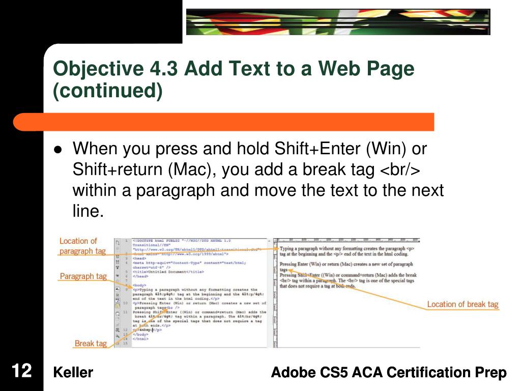 Objective 4.3 Add Text to a Web Page (continued) • When you press and hold Shift+Enter (Win) or Shift+return (Mac), you add a break tag <br/> within a paragraph and move the text to the next line. 12 12