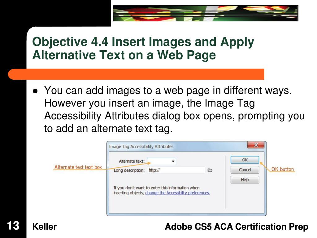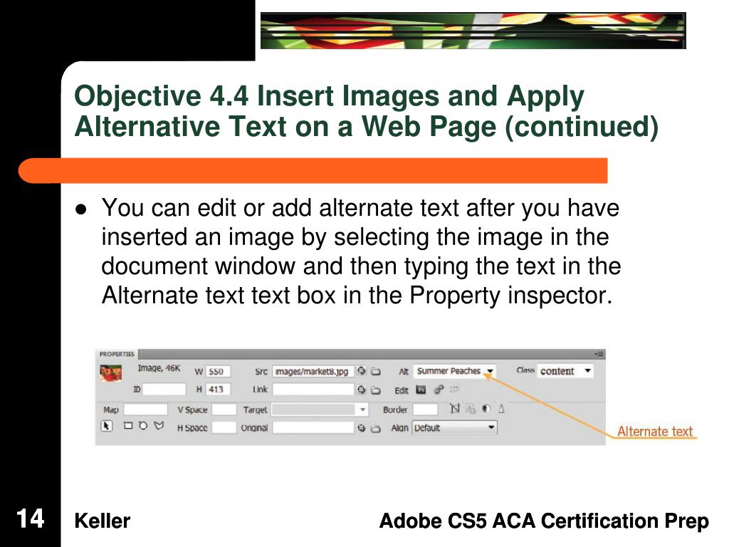 Objective 4.4 Insert Images and Apply Alternative Text on a Web Page • You can add images to a web page in different ways. However you insert an image, the Image Tag Accessibility Attributes dialog box opens, prompting you to add an alternate text tag. 13 13