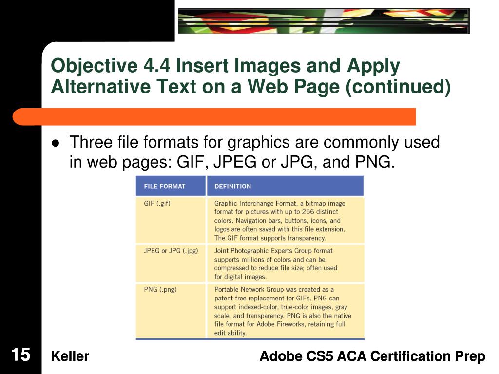 Objective 4.4 Insert Images and Apply Alternative Text on a Web Page (continued) • Three file formats for graphics are commonly used in web pages: GIF, JPEG or JPG, and PNG. 15 15