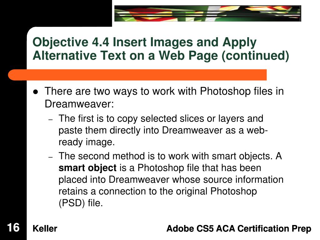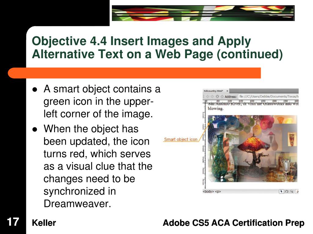 Objective 4.4 Insert Images and Apply Alternative Text on a Web Page (continued) • There are two ways to work with Photoshop files in Dreamweaver: • The first is to copy selected slices or layers and paste them directly into Dreamweaver as a web-ready image. • The second method is to work with smart objects. A smart object is a Photoshop file that has been placed into Dreamweaver whose source information retains a connection to the original Photoshop (PSD) file. 16 16