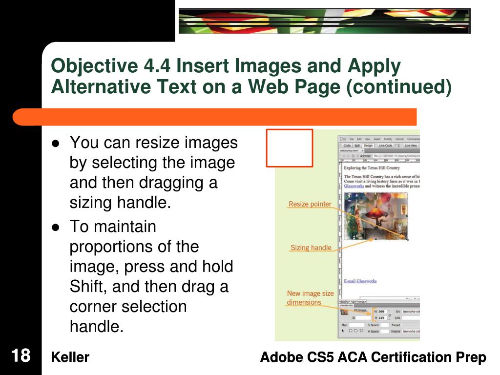 Objective 4.4 Insert Images and Apply Alternative Text on a Web Page (continued) • A smart object contains a green icon in the upper-left corner of the image. • When the object has been updated, the icon turns red, which serves as a visual clue that the changes need to be synchronized in Dreamweaver. 17 17