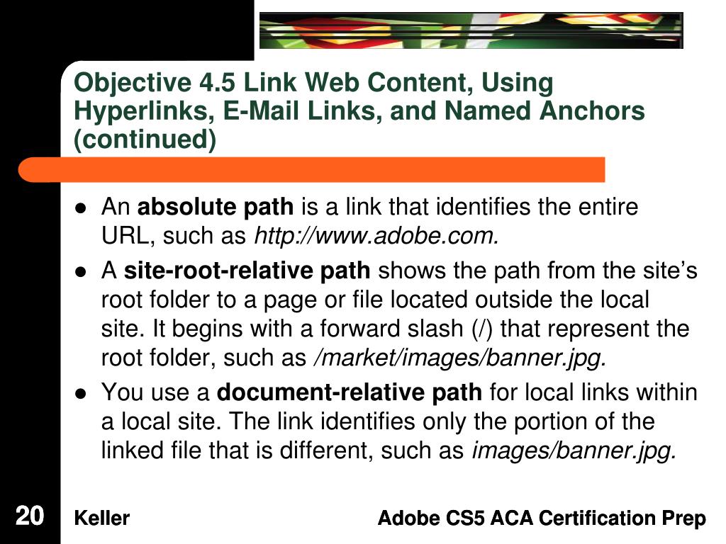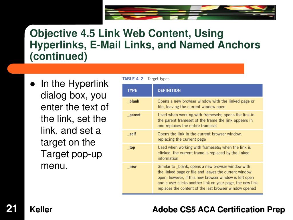 Objective 4.5 Link Web Content, Using Hyperlinks, E-Mail Links, and Named Anchors (continued) • An absolute path is a link that identifies the entire URL, such as http://www.adobe.com. • A site-root-relative path shows the path from the site’s root folder to a page or file located outside the local site. It begins with a forward slash (/) that represent the root folder, such as /market/images/banner.jpg. • You use a document-relative path for local links within a local site. The link identifies only the portion of the linked file that is different, such as images/banner.jpg. 20 20