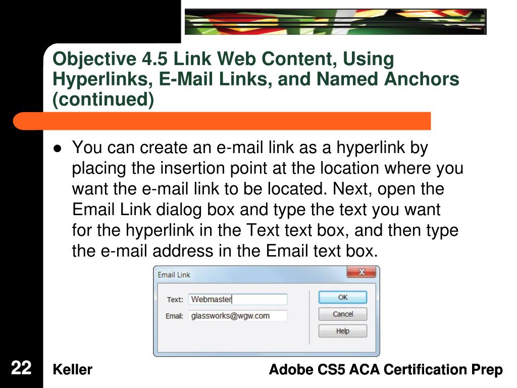 Objective 4.5 Link Web Content, Using Hyperlinks, E-Mail Links, and Named Anchors (continued) • In the Hyperlink dialog box, you enter the text of the link, set the link, and set a target on the Target pop-up menu. 21 21