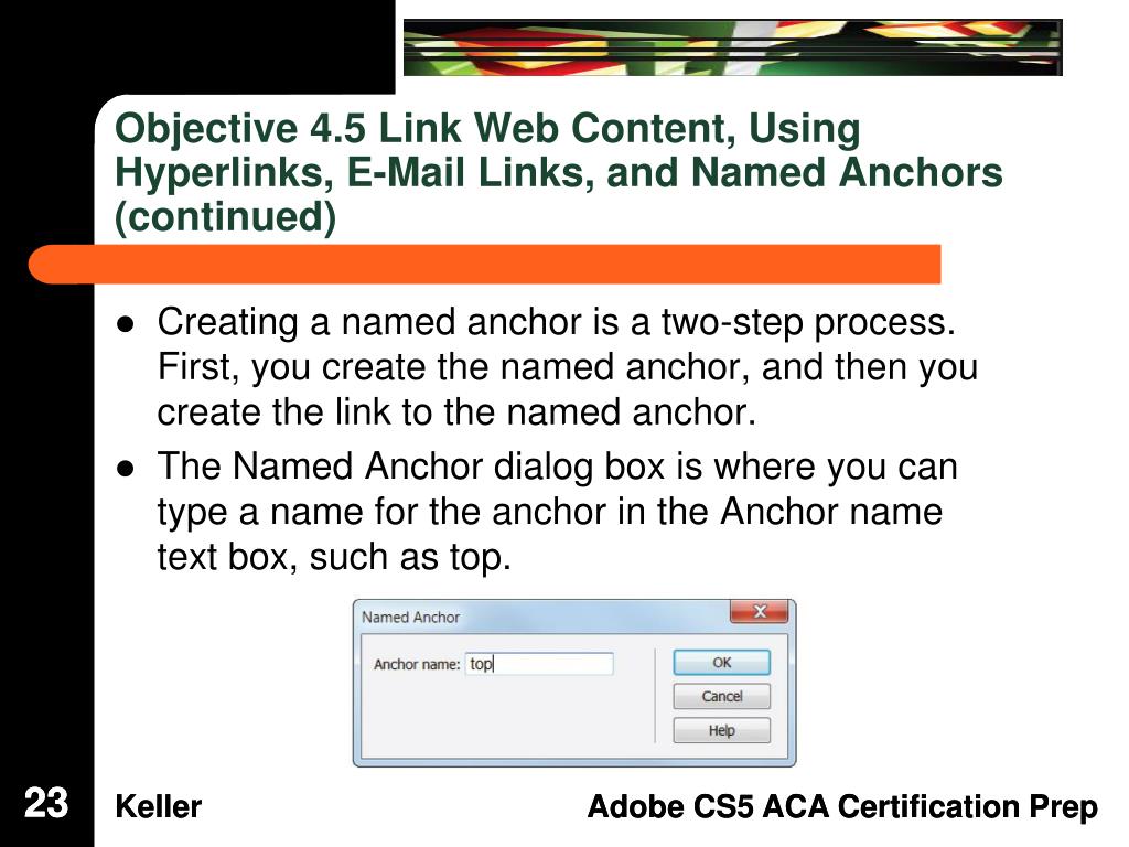 Objective 4.5 Link Web Content, Using Hyperlinks, E-Mail Links, and Named Anchors (continued) • You can create an e-mail link as a hyperlink by placing the insertion point at the location where you want the e-mail link to be located. Next, open the Email Link dialog box and type the text you want for the hyperlink in the Text text box, and then type the e-mail address in the Email text box. 22 22