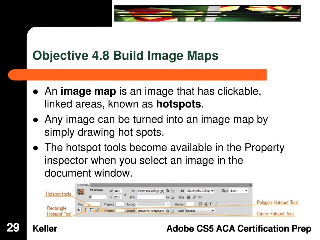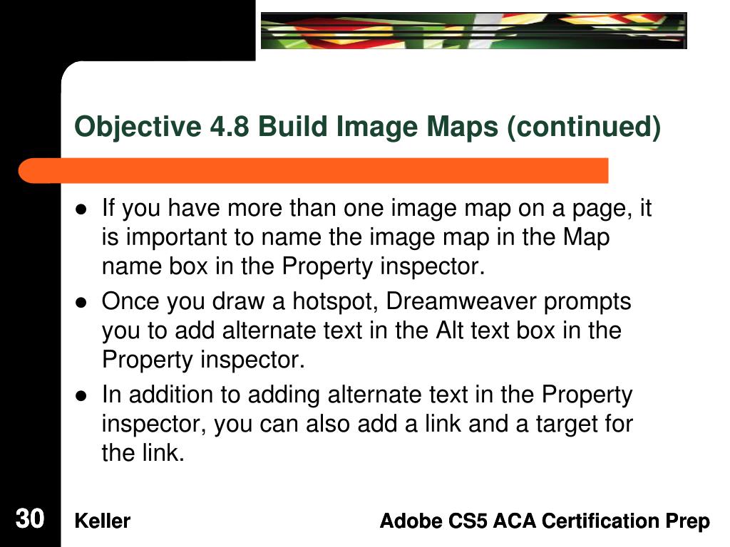 Objective 4.8 Build Image Maps • An image map is an image that has clickable, linked areas, known as hotspots. • Any image can be turned into an image map by simply drawing hot spots. • The hotspot tools become available in the Property inspector when you select an image in the document window. 29 29