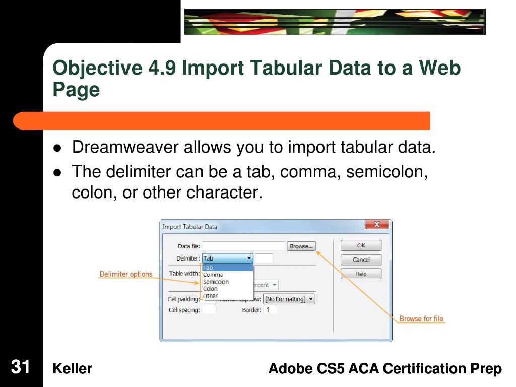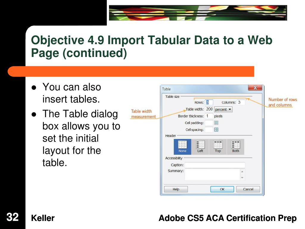 Objective 4.9 Import Tabular Data to a Web Page • Dreamweaver allows you to import tabular data. • The delimiter can be a tab, comma, semicolon, colon, or other character. 31 31