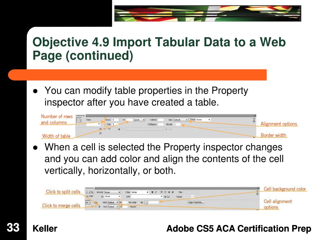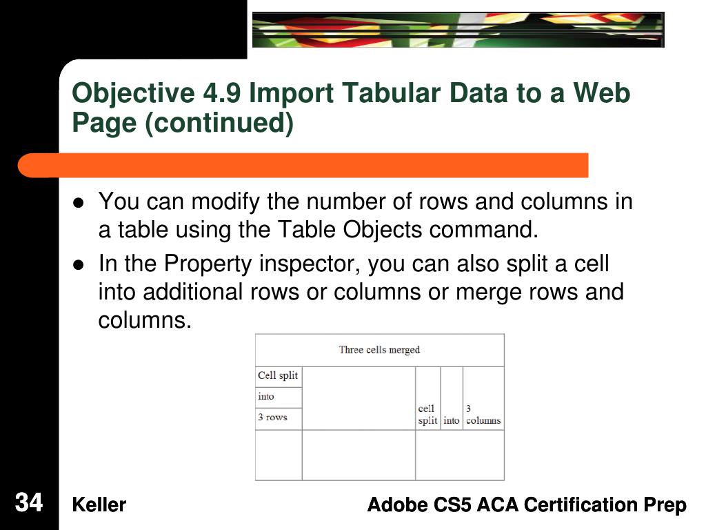 Objective 4.9 Import Tabular Data to a Web Page (continued) • You can modify table properties in the Property inspector after you have created a table. • When a cell is selected the Property inspector changes and you can add color and align the contents of the cell vertically, horizontally, or both. 33 33