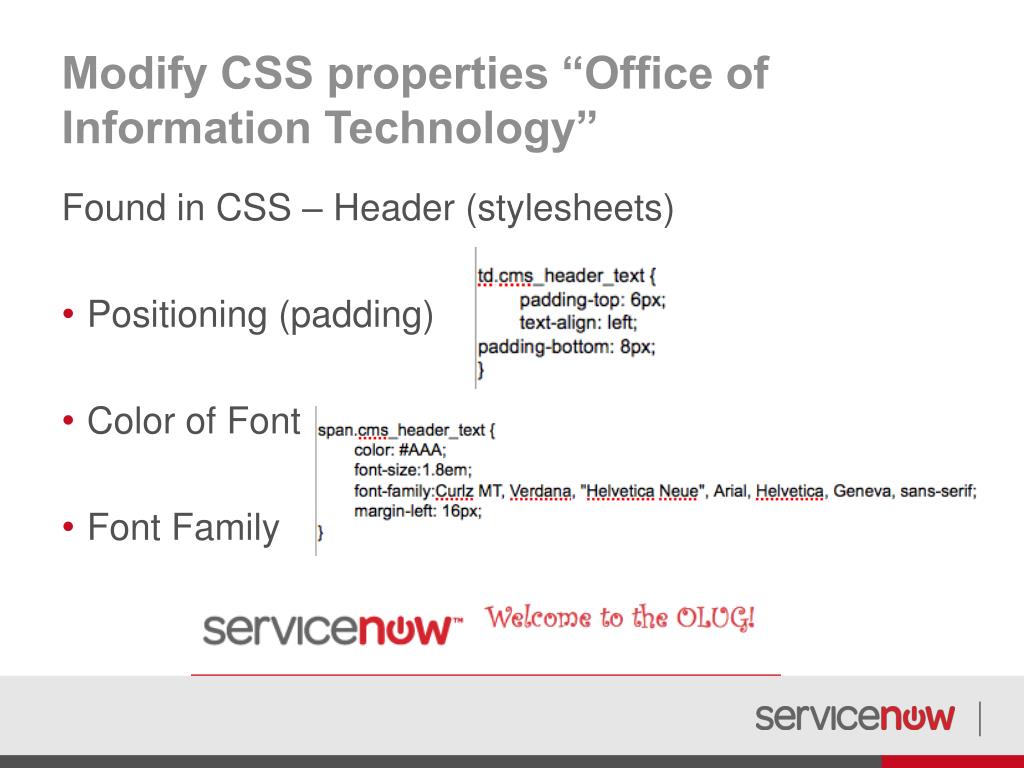 Modify CSS properties “Office of Information Technology” Found in CSS – Header (stylesheets) • Positioning (padding) • Color of Font • Font Family