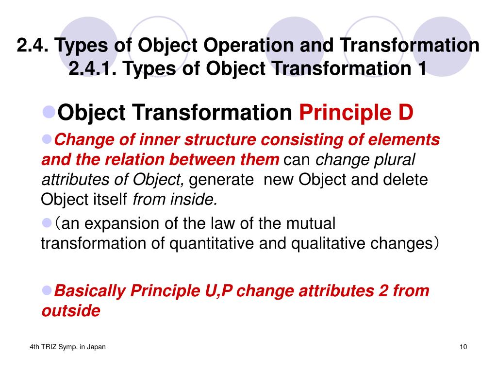 2.4. Types of Object Operation and Transformation2.4.1. Types of Object Transformation 1 • Object TransformationPrinciple D • Change of inner structure consisting of elements and the relation between themcan change plural attributes of Object, generate new Object and delete Object itself from inside. • (an expansion of the law of the mutual transformation of quantitative and qualitative changes) • Basically Principle U,P change attributes 2 from outside