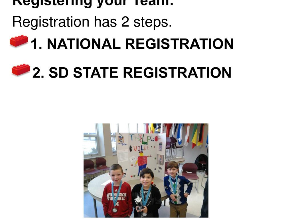 Registering your Team: Registration has 2 steps. • 1. NATIONAL REGISTRATION • 2. SD STATE REGISTRATION