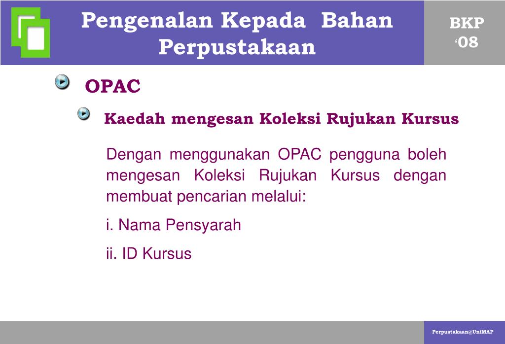 Pengenalan Kepada Bahan Perpustakaan BKP ‘08 AKTIVITI PENYELIDIKAN OPAC • . Kaedah mengesan Koleksi Rujukan Kursus • . Dengan menggunakan OPAC pengguna boleh mengesan Koleksi Rujukan Kursus dengan membuat pencarian melalui: i. Nama Pensyarah ii. ID Kursus Perpustakaan@UniMAP Perpustakaan@UniMAP