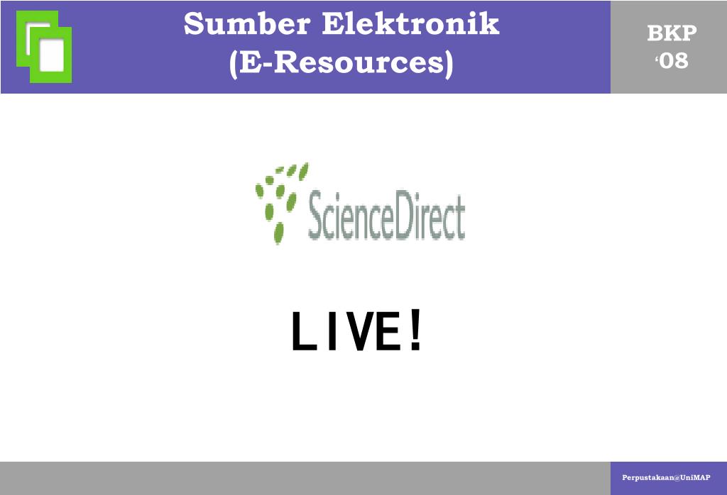 Sumber Elektronik (E-Resources) BKP ‘08 AKTIVITI PENYELIDIKAN LIVE! Perpustakaan@UniMAP Perpustakaan@UniMAP