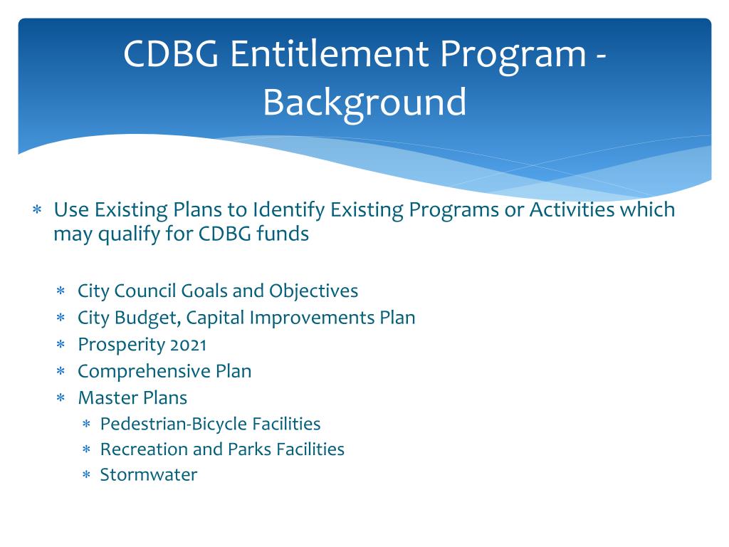 CDBG Entitlement Program - Background • Use Existing Plans to Identify Existing Programs or Activities which may qualify for CDBG funds • City Council Goals and Objectives • City Budget, Capital Improvements Plan • Prosperity 2021 • Comprehensive Plan • Master Plans • Pedestrian-Bicycle Facilities • Recreation and Parks Facilities • Stormwater