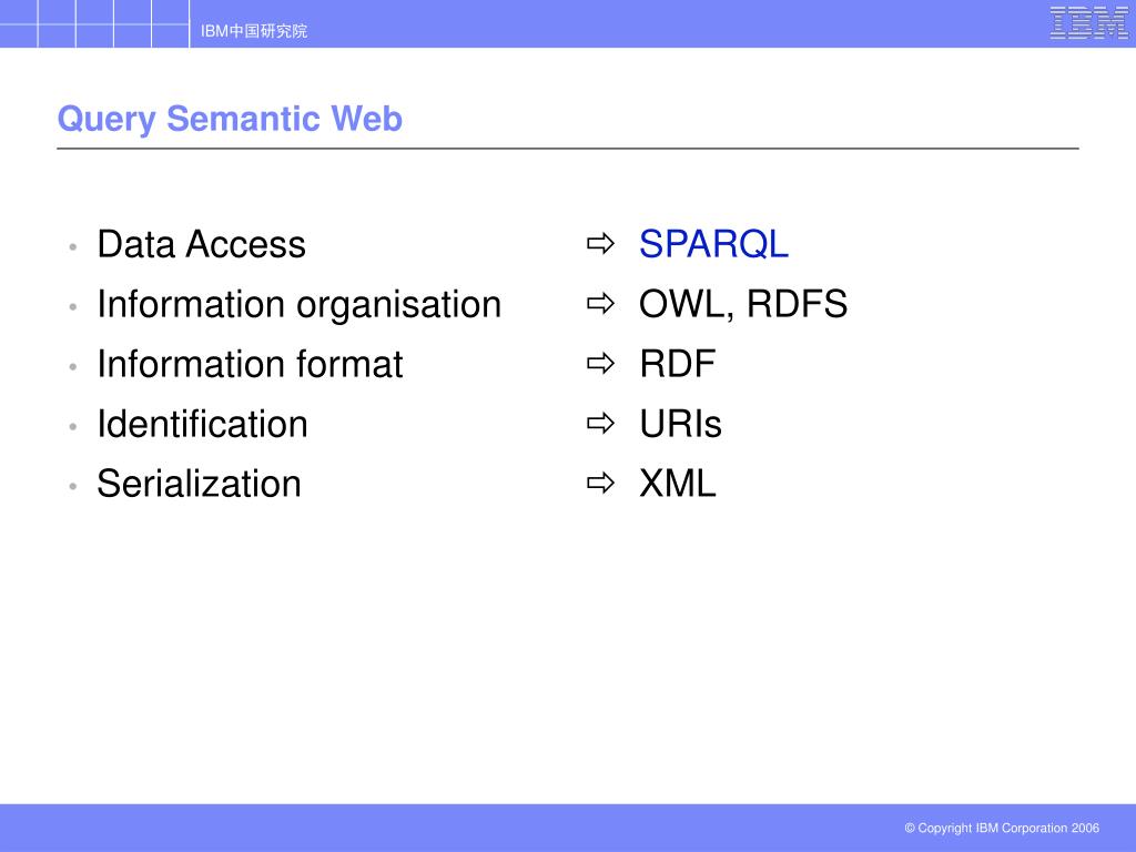 Query Semantic Web • Data Access • Information organisation • Information format • Identification • Serialization • SPARQL • OWL, RDFS • RDF • URIs • XML