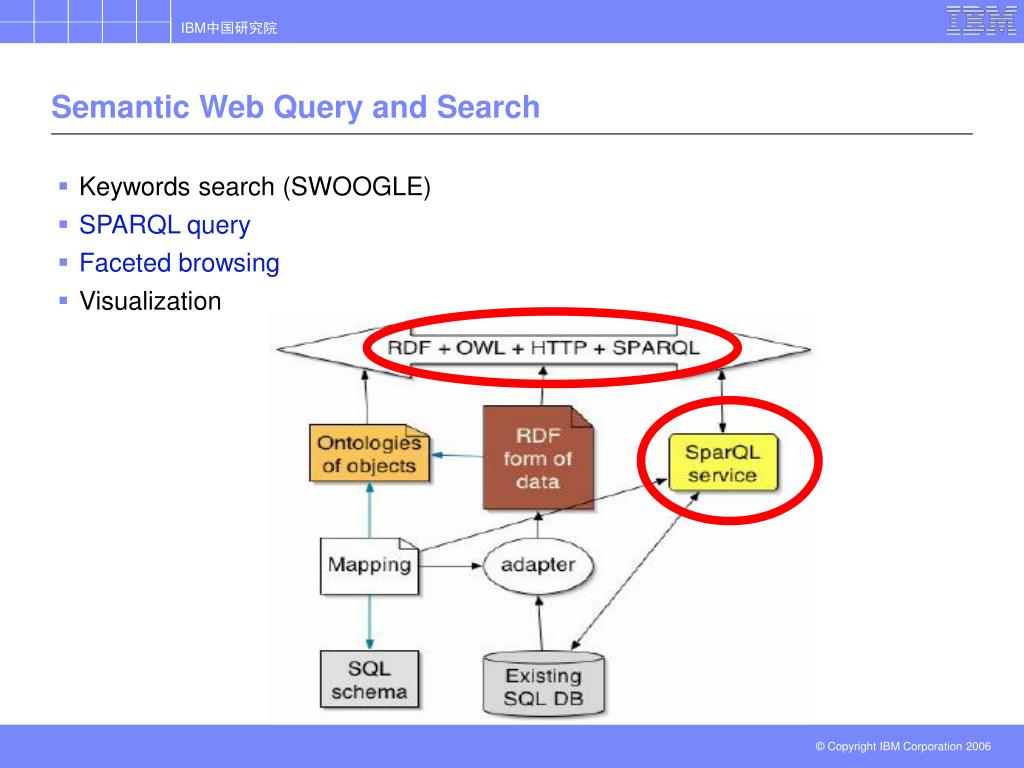 Semantic Web Query and Search • Keywords search (SWOOGLE) • SPARQL query • Faceted browsing • Visualization