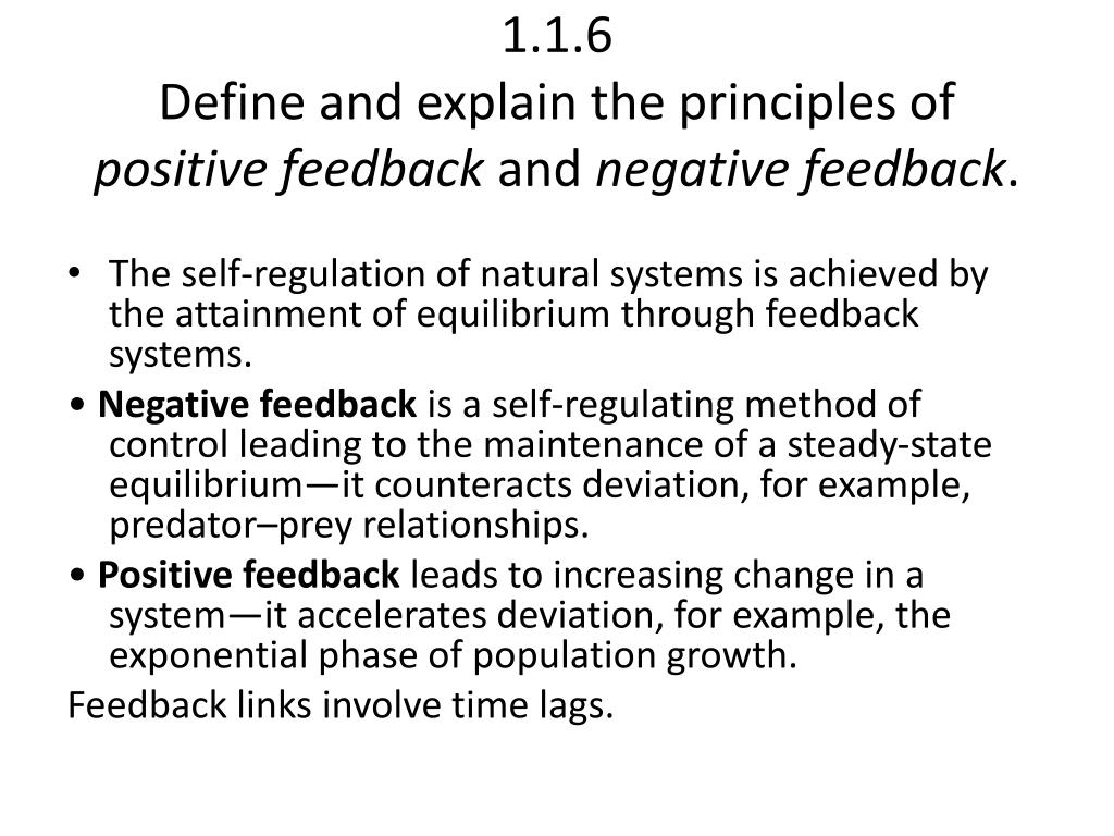 1.1.6Define and explain the principles of positive feedback and negative feedback. • The self-regulation of natural systems is achieved by the attainment of equilibrium through feedback systems. • Negative feedback is a self-regulating method of control leading to the maintenance of a steady-state equilibrium—it counteracts deviation, for example, predator–prey relationships. • Positive feedback leads to increasing change in a system—it accelerates deviation, for example, the exponential phase of population growth. Feedback links involve time lags.