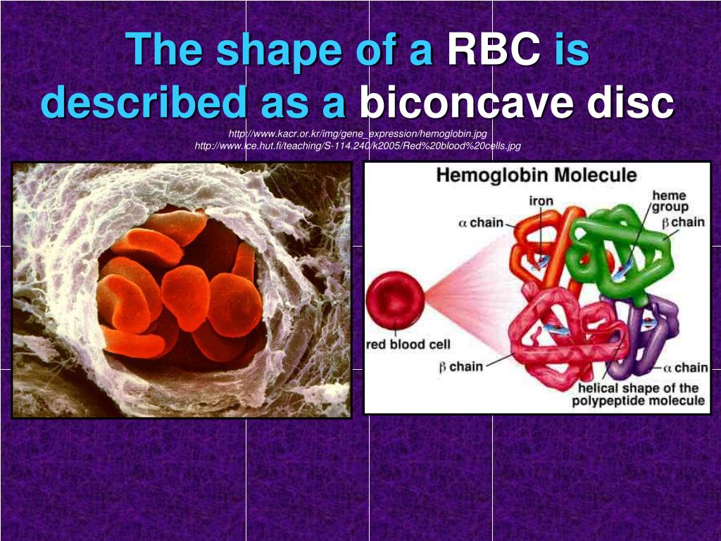 The shape of a RBC is described as a biconcave dischttp://www.kacr.or.kr/img/gene_expression/hemoglobin.jpghttp://www.lce.hut.fi/teaching/S-114.240/k2005/Red%20blood%20cells.jpg