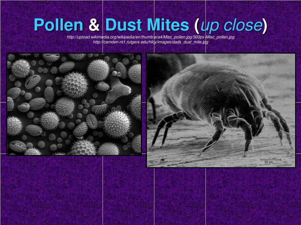 Pollen & Dust Mites (up close)http://upload.wikimedia.org/wikipedia/en/thumb/a/a4/Misc_pollen.jpg/300px-Misc_pollen.jpghttp://camden-nt1.rutgers.edu/hfcy/images/dads_dust_mite.jpg
