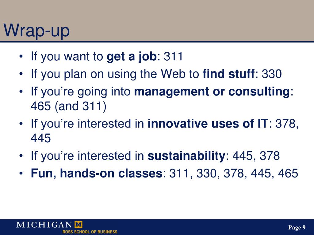 Wrap-up • If you want to get a job: 311 • If you plan on using the Web to find stuff: 330 • If you’re going into management or consulting: 465 (and 311) • If you’re interested in innovative uses of IT: 378, 445 • If you’re interested in sustainability: 445, 378 • Fun, hands-on classes: 311, 330, 378, 445, 465