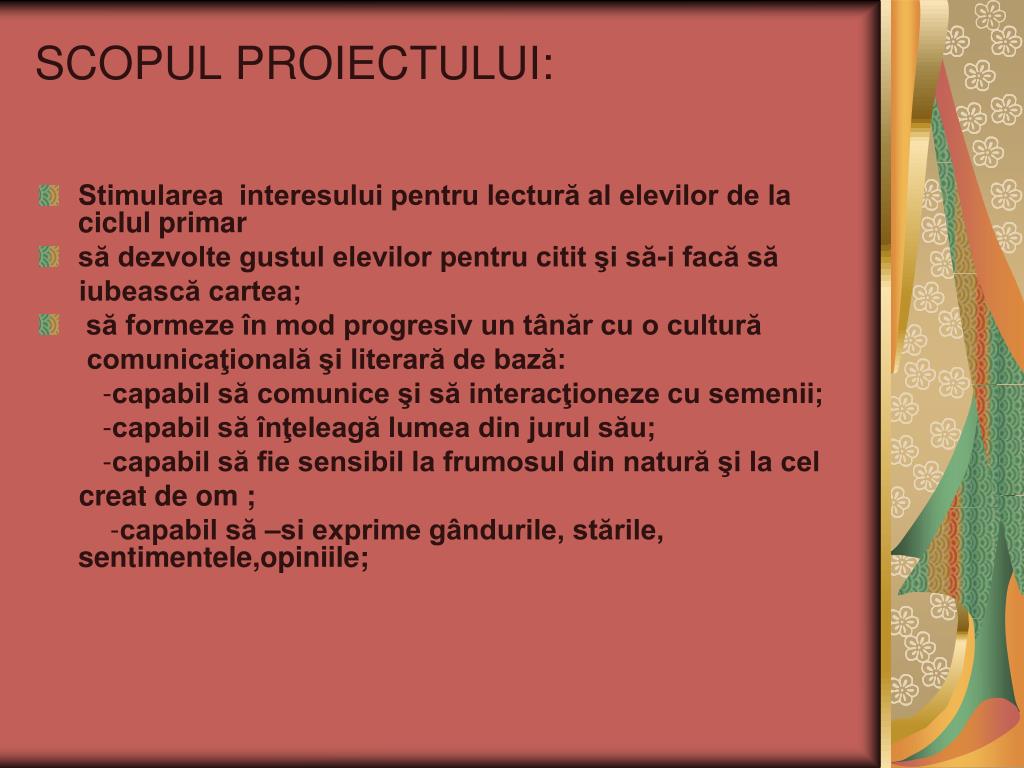 SCOPUL PROIECTULUI: • Stimularea interesului pentru lectură al elevilor de la ciclul primar • să dezvolte gustul elevilor pentru citit şi să-i facă să iubească cartea; • să formeze în mod progresiv un tânăr cu o cultură comunicaţională şi literară de bază: -capabil să comunice şi să interacţioneze cu semenii; -capabil să înţeleagă lumea din jurul său; -capabil să fie sensibil la frumosul din natură şi la cel creat de om ; -capabil să –si exprime gândurile, stările, sentimentele,opiniile;