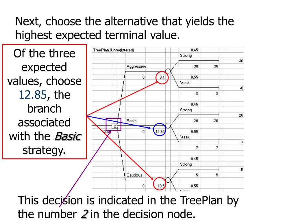 Next, choose the alternative that yields the highest expected terminal value. Of the three expected values, choose 12.85, the branch associated with the Basic strategy. This decision is indicated in the TreePlan by the number 2 in the decision node.