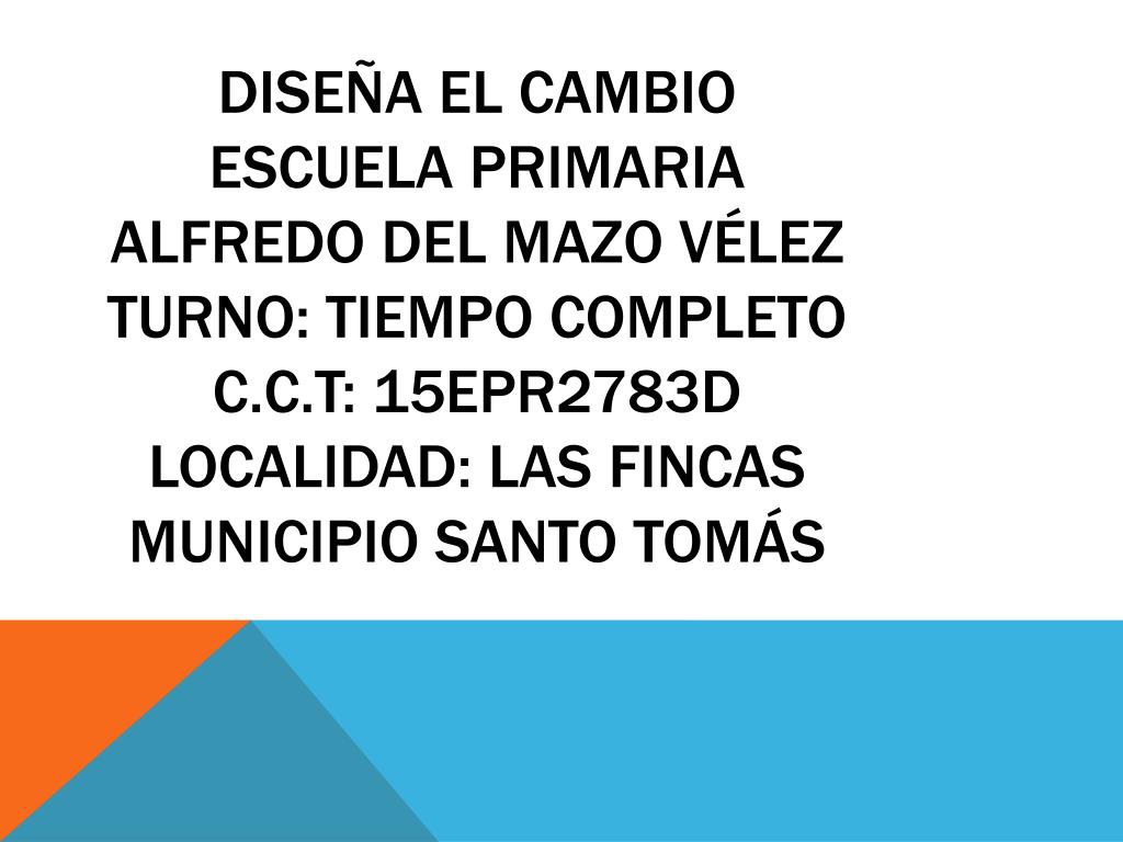 DISEÑA EL CAMBIO ESCUELA PRIMARIA ALFREDO DEL MAZO VÉLEZ TURNO: TIEMPO COMPLETO C.C.T: 15EPR2783D LOCALIDAD: LAS FINCAS MUNICIPIO SANTO TOMÁS. MI ESCUELA SIEMPRE AGRADABLE