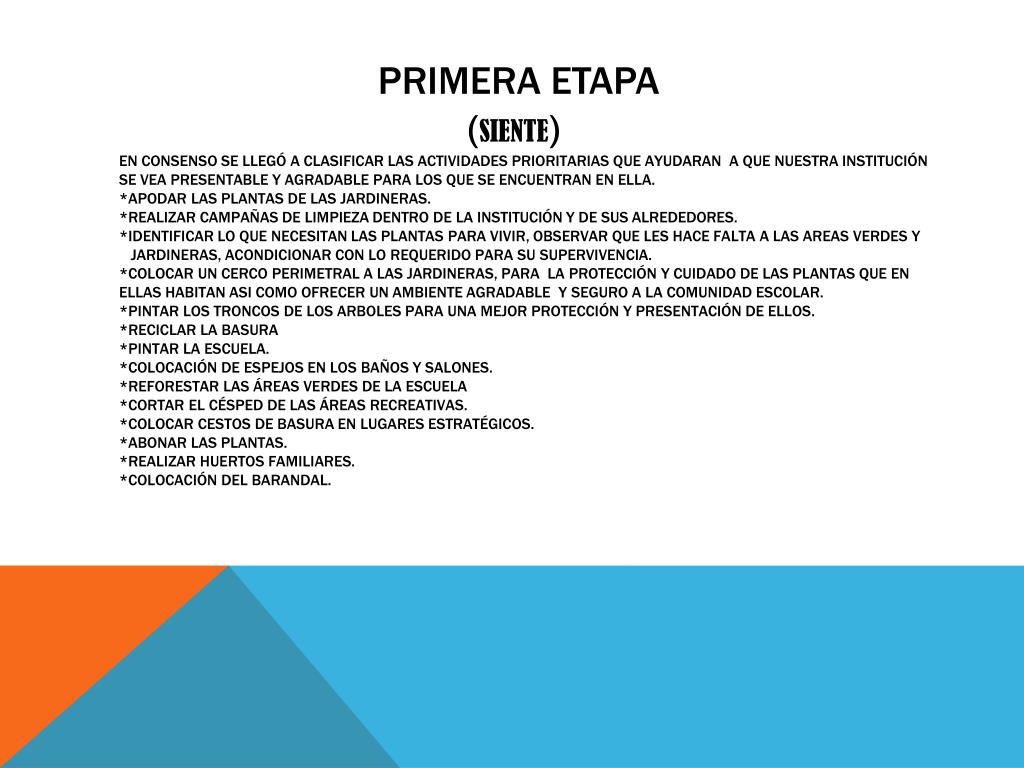 PRIMERA ETAPA (SIENTE)EN CONSENSO SE LLEGÓ A CLASIFICAR LAS ACTIVIDADES PRIORITARIAS QUE AYUDARAN A QUE NUESTRA INSTITUCIÓN SE VEA PRESENTABLE Y AGRADABLE PARA LOS QUE SE ENCUENTRAN EN ELLA. *APODAR LAS PLANTAS DE LAS JARDINERAS.*REALIZAR CAMPAÑAS DE LIMPIEZA DENTRO DE LAINSTITUCIÓN Y DE SUS ALREDEDORES.*IDENTIFICAR LO QUE NECESITAN LAS PLANTAS PARA VIVIR, OBSERVAR QUE LES HACE FALTA A LAS AREAS VERDES Y JARDINERAS, ACONDICIONAR CON LO REQUERIDO PARA SU SUPERVIVENCIA. *COLOCAR UN CERCO PERIMETRAL A LAS JARDINERAS, PARA LA PROTECCIÓN Y CUIDADO DE LAS PLANTAS QUE EN ELLAS HABITAN ASI COMO OFRECER UN AMBIENTE AGRADABLE Y SEGURO A LA COMUNIDAD ESCOLAR.*PINTAR LOS TRONCOS DE LOS ARBOLES PARA UNA MEJORPROTECCIÓN Y PRESENTACIÓN DE ELLOS.*Reciclar la basura*Pintar la escuela.*Colocación de espejos en los baños y salones.*reforestar las áreas verdes de la escuela *Cortar el césped de las áreas recreativas.*Colocar cestos de basura en lugares estratégicos.*Abonar las plantas.*Realizar huertos familiares.*Colocación del barandal.