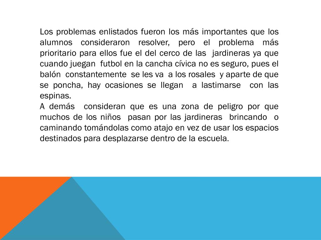 Los problemas enlistados fueron los más importantes que los alumnos consideraron resolver, pero el problema más prioritario para ellos fue el del cerco de las jardineras ya que cuando juegan futbol en la cancha cívica no es seguro, pues el balón constantemente se les va a los rosales y aparte de que se poncha, hay ocasiones se llegan a lastimarse con las espinas. A demás consideran que es una zona de peligro por que muchos de los niños pasan por las jardineras brincando o caminando tomándolas como atajo en vez de usar los espacios destinados para desplazarse dentro de la escuela.