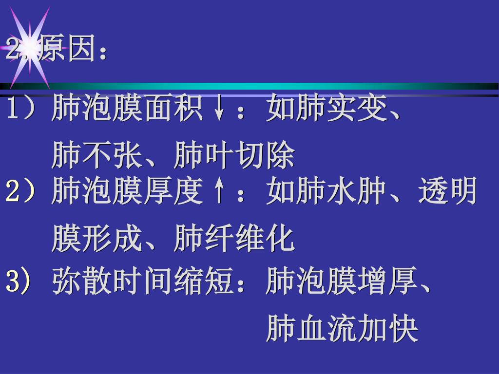 2.原因: 1)肺泡膜面积↓:如肺实变、 肺不张、肺叶切除 2)肺泡膜厚度↑:如肺水肿、透明 膜形成、肺纤维化 3) 弥散时间缩短:肺泡膜增厚、 肺血流加快