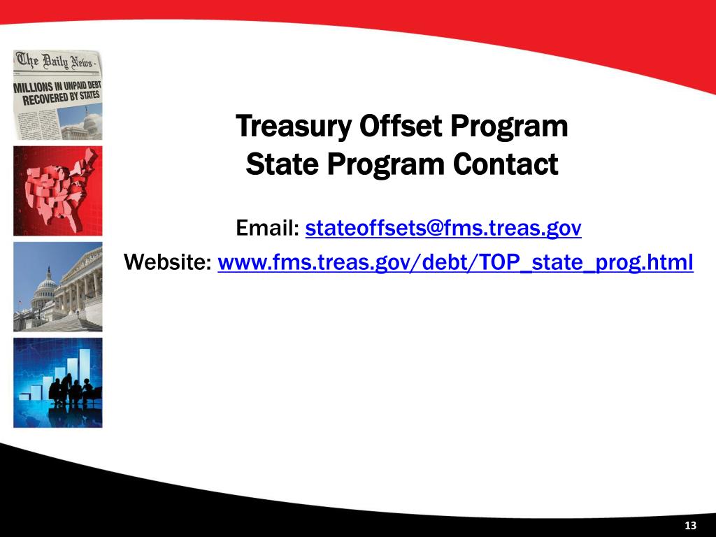 Treasury Offset Program State Program Contact Email: stateoffsets@fms.treas.gov Website: www.fms.treas.gov/debt/TOP_state_prog.html