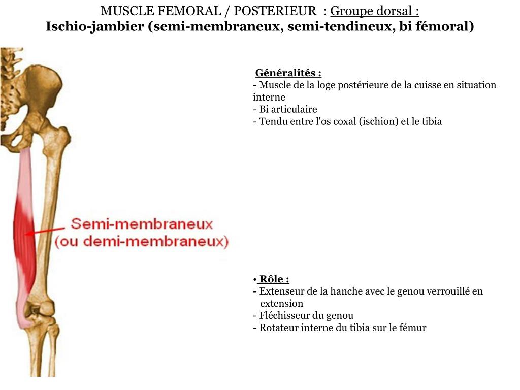MUSCLE FEMORAL / POSTERIEUR : Groupe dorsal :Ischio-jambier (semi-membraneux, semi-tendineux, bi fémoral) • Généralités :- Muscle de la loge postérieure de la cuisse en situation interne- Bi articulaire- Tendu entre l'os coxal (ischion) et le tibia • Rôle : - Extenseur de la hanche avec le genou verrouillé en extension- Fléchisseur du genou- Rotateur interne du tibia sur le fémur