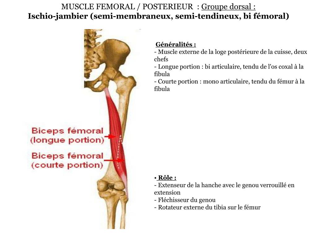 MUSCLE FEMORAL / POSTERIEUR : Groupe dorsal :Ischio-jambier (semi-membraneux, semi-tendineux, bi fémoral) • Généralités :- Muscle externe de la loge postérieure de la cuisse, deux chefs- Longue portion : bi articulaire, tendu de l'os coxal à la fibula- Courte portion : mono articulaire, tendu du fémur à la fibula • Rôle : - Extenseur de la hanche avec le genou verrouillé en extension- Fléchisseur du genou - Rotateur externe du tibia sur le fémur