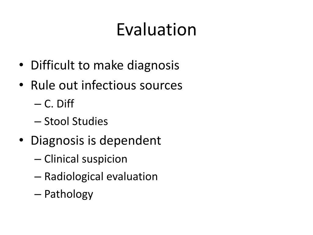 Evaluation • Difficult to make diagnosis • Rule out infectious sources • C. Diff • Stool Studies • Diagnosis is dependent • Clinical suspicion • Radiological evaluation • Pathology