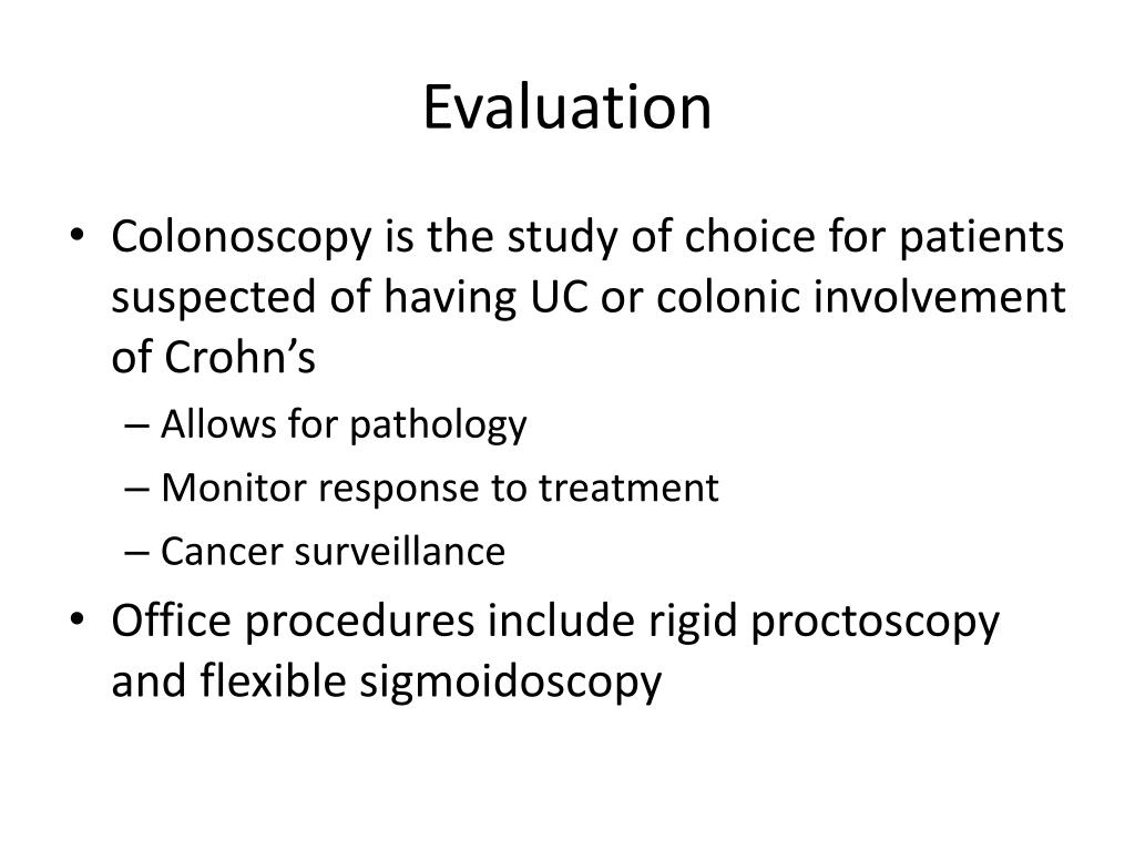 Evaluation • Colonoscopy is the study of choice for patients suspected of having UC or colonic involvement of Crohn’s • Allows for pathology • Monitor response to treatment • Cancer surveillance • Office procedures include rigid proctoscopy and flexible sigmoidoscopy