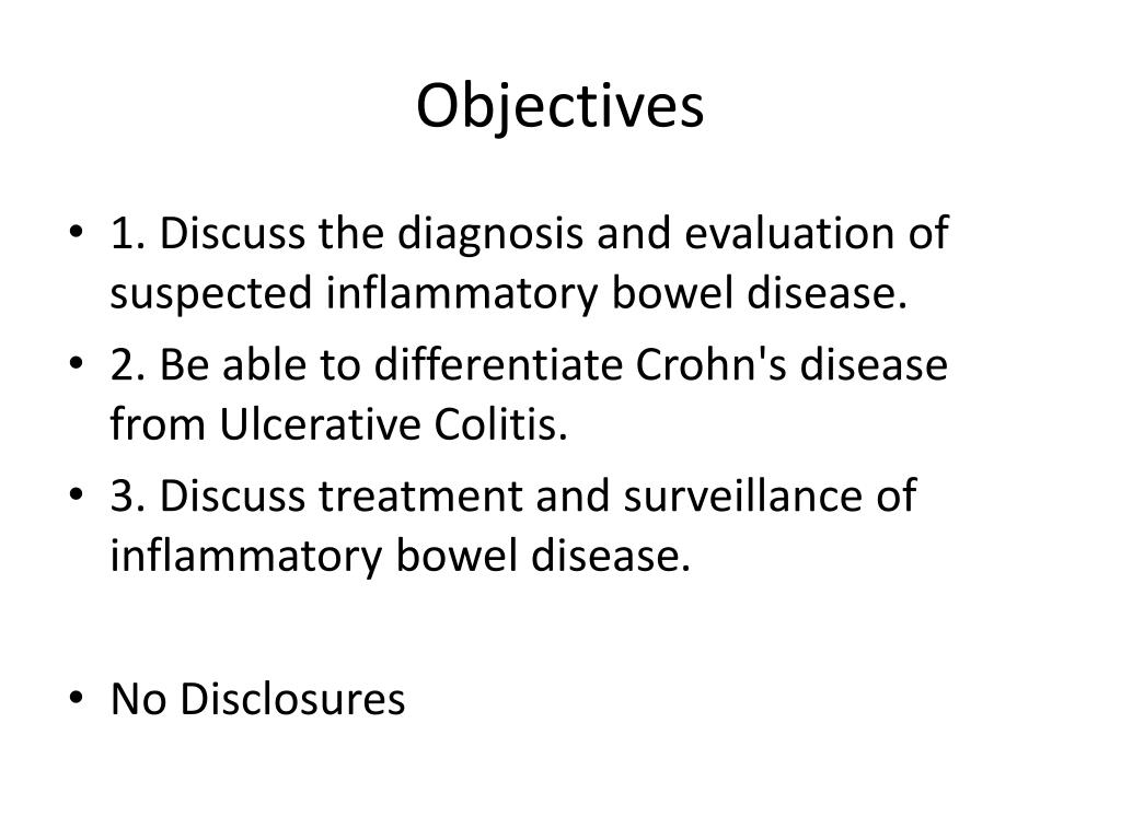 Objectives • 1. Discuss the diagnosis and evaluation of suspected inflammatory bowel disease. • 2. Be able to differentiate Crohn's disease from Ulcerative Colitis. • 3. Discuss treatment and surveillance of inflammatory bowel disease. • No Disclosures