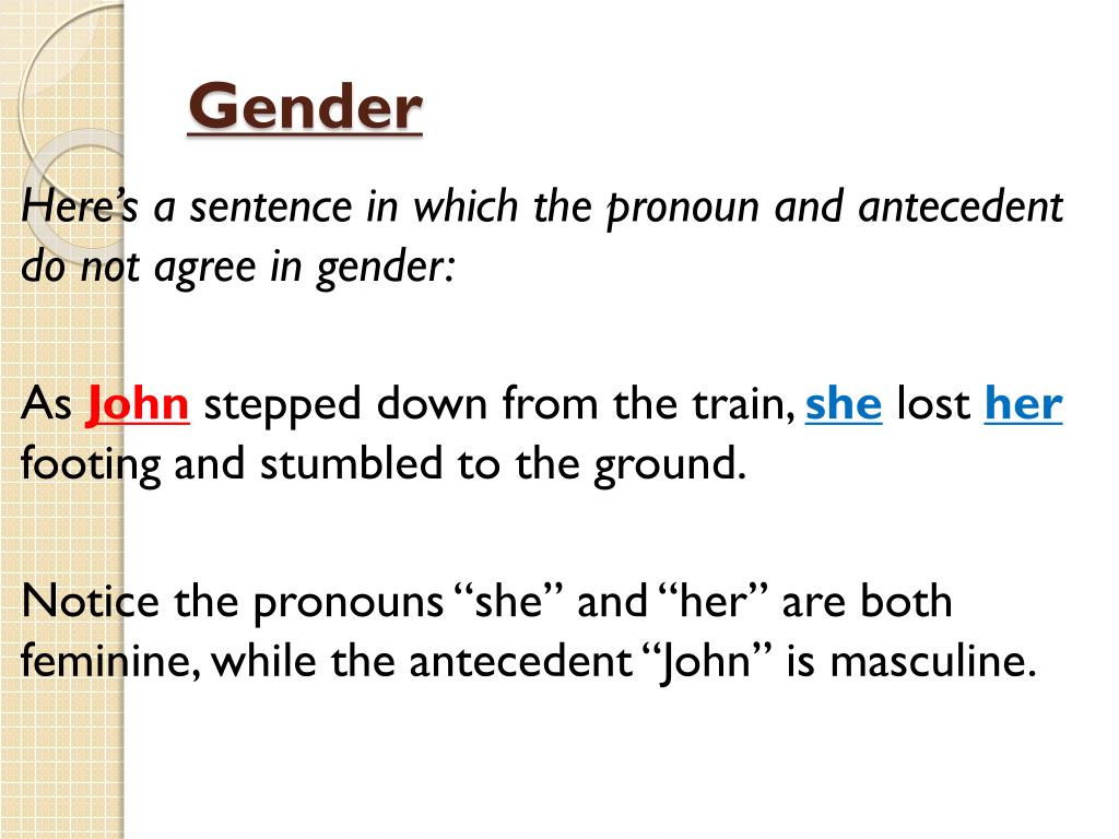 Gender Here’s a sentence in which the pronoun and antecedent do not agree in gender: As John stepped down from the train, shelost her footing and stumbled to the ground. Notice the pronouns “she” and “her” are both feminine, while the antecedent “John” is masculine.