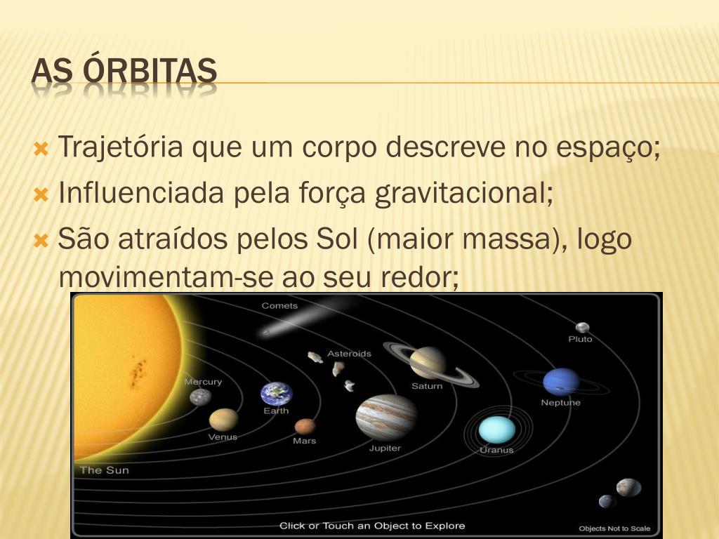 Trajetória que um corpo descreve no espaço; Influenciada pela força gravitacional; São atraídos pelos Sol (maior massa), logo movimentam-se ao seu redor; As órbitas