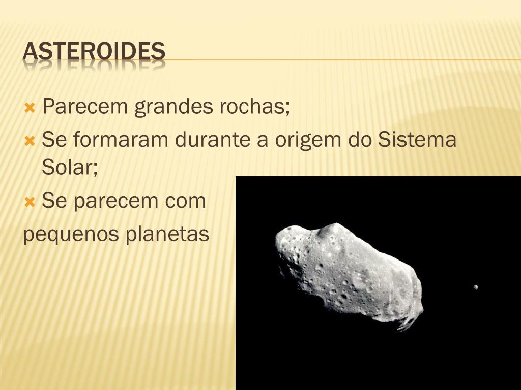 Parecem grandes rochas; Se formaram durante a origem do Sistema Solar; Se parecem com pequenos planetas Asteroides