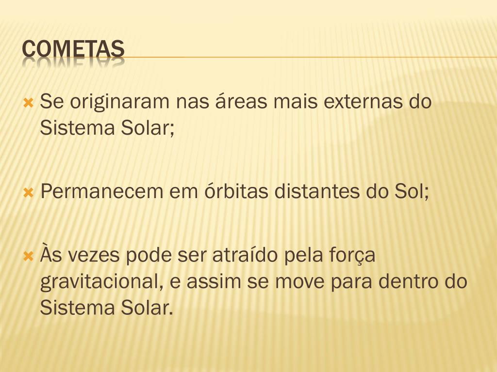 Se originaram nas áreas mais externas do Sistema Solar; Permanecem em órbitas distantes do Sol; Às vezes pode ser atraído pela força gravitacional, e assim se move para dentro do Sistema Solar. cometas