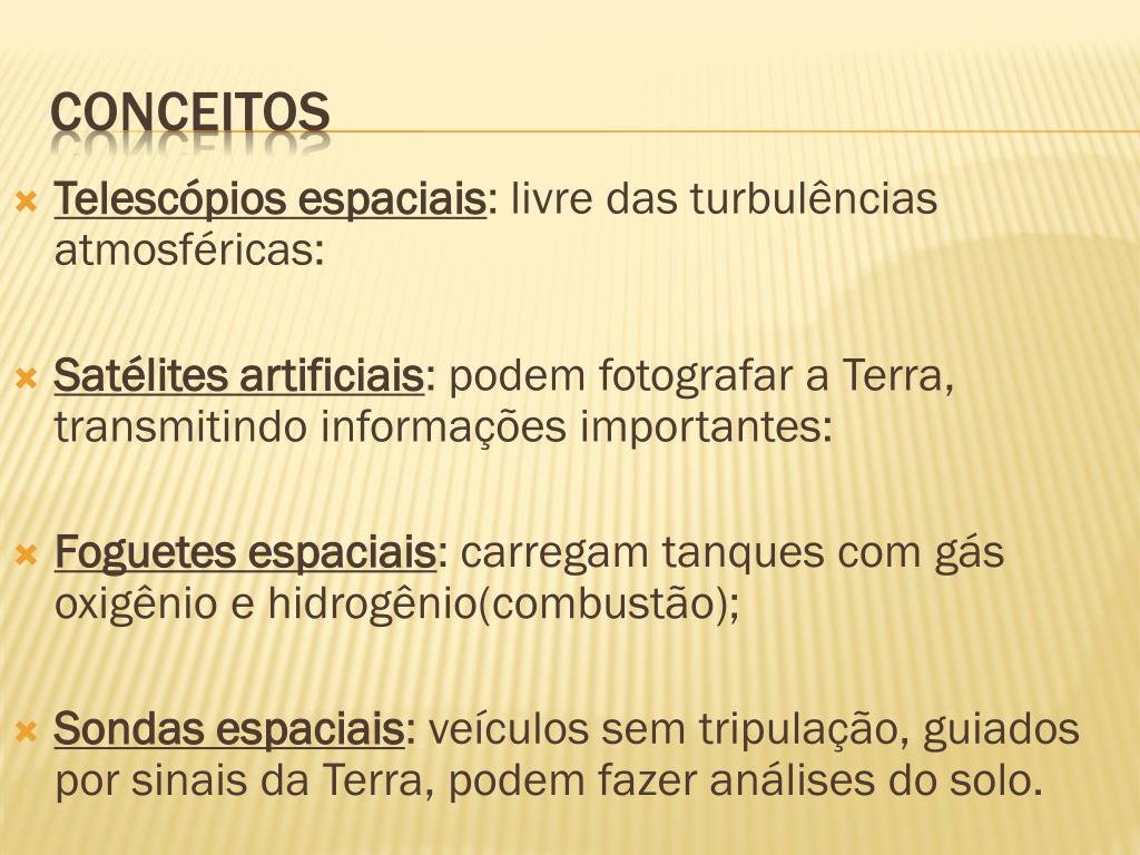 Telescópios espaciais: livre das turbulências atmosféricas: Satélites artificiais: podem fotografar a Terra, transmitindo informações importantes: Foguetes espaciais: carregam tanques com gás oxigênio e hidrogênio(combustão); Sondas espaciais: veículos sem tripulação, guiados por sinais da Terra, podem fazer análises do solo. Conceitos