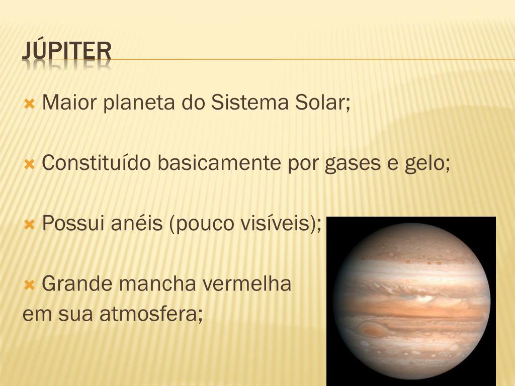 Maior planeta do Sistema Solar; Constituído basicamente por gases e gelo; Possui anéis (pouco visíveis); Grande mancha vermelha em sua atmosfera; júpiter