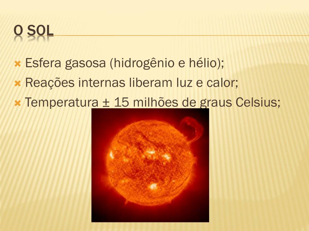 Esfera gasosa (hidrogênio e hélio); Reações internas liberam luz e calor; Temperatura ± 15 milhões de graus Celsius; O sol