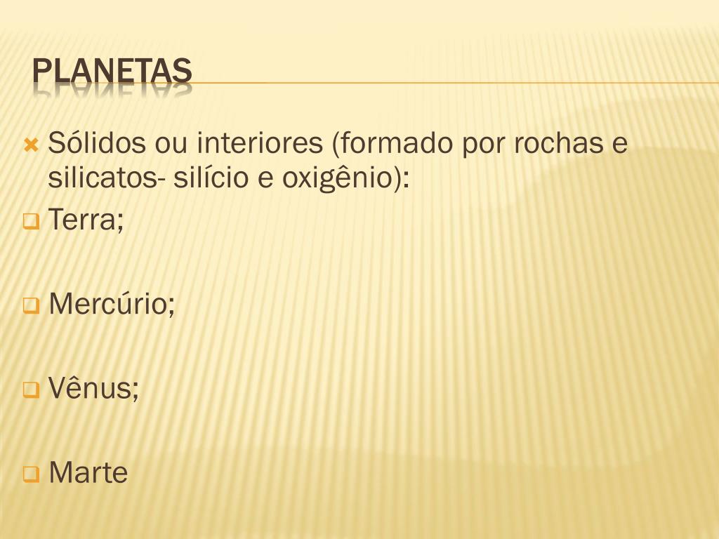 Sólidos ou interiores (formado por rochas e silicatos- silício e oxigênio): • Terra; • Mercúrio; • Vênus; • Marte Planetas